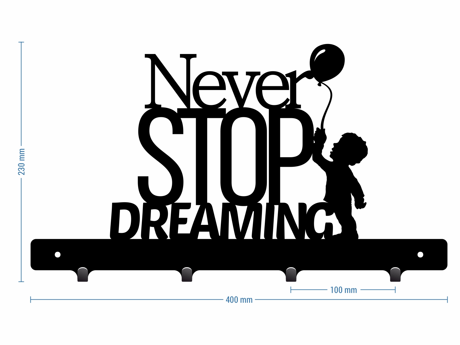 Unikatowy krótki wieszak ścienny do przedpokoju z 4 haczykami. Jego całkowita szerokość wynosi 40 centymetrów. Dekoracyjny napis na wieszaku „Never stop dreaming” wniesie do Twojego przedpokoju pozytywną atmosferę!