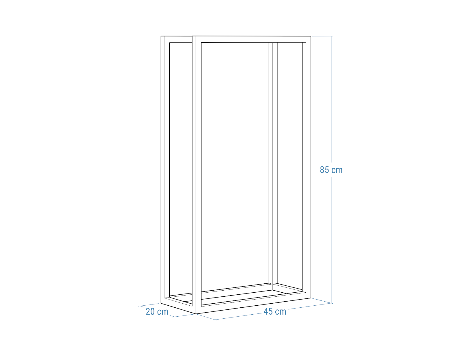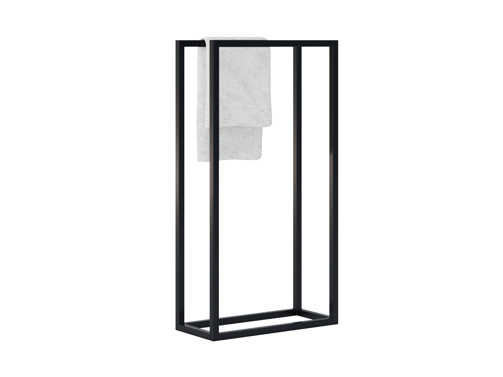 Wieszak na ręczniki stojący podwójny. Mierzy 85 cm wysokości, 45 cm szerokości i 20 cm głębokości. Wykonany z solidnego profilu stalowego.