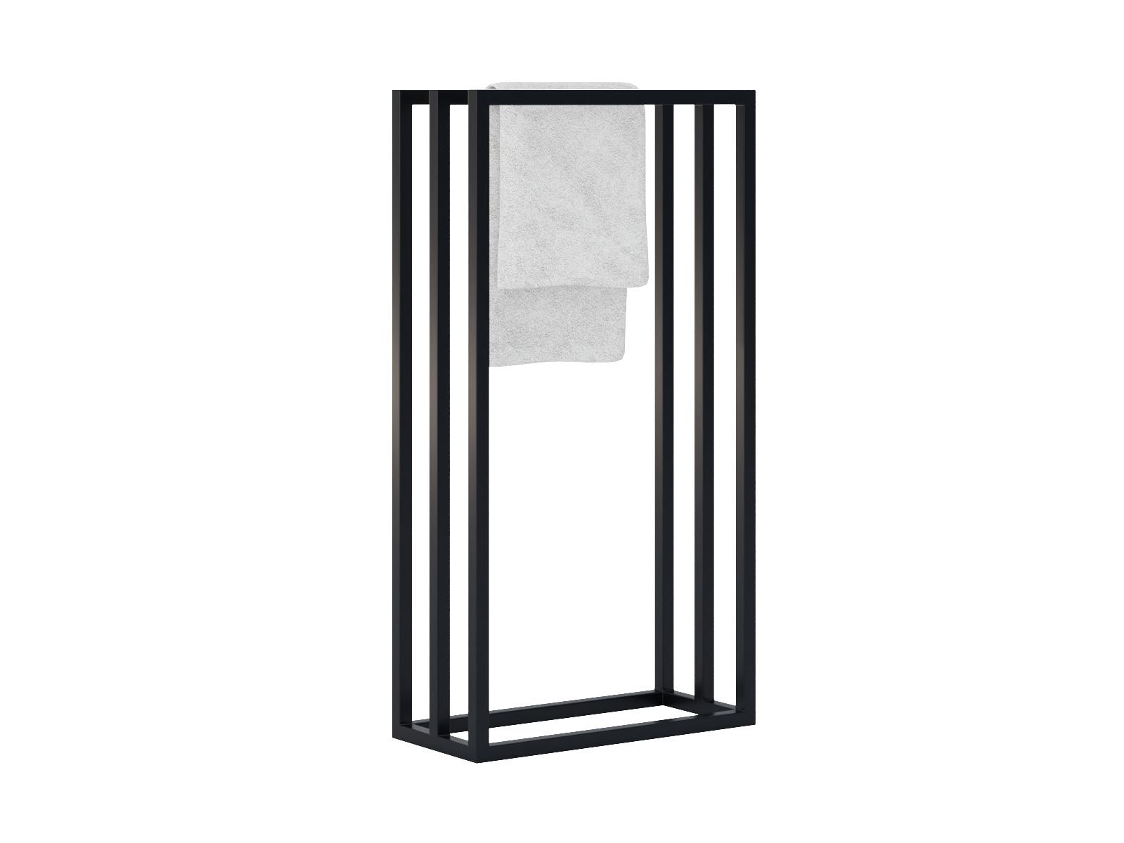 Wieszak na ręczniki stojący potrójny. Mierzy 85 cm wysokości, 45 cm szerokości i 20 cm głębokości. Wykonany z solidnego profilu stalowego.