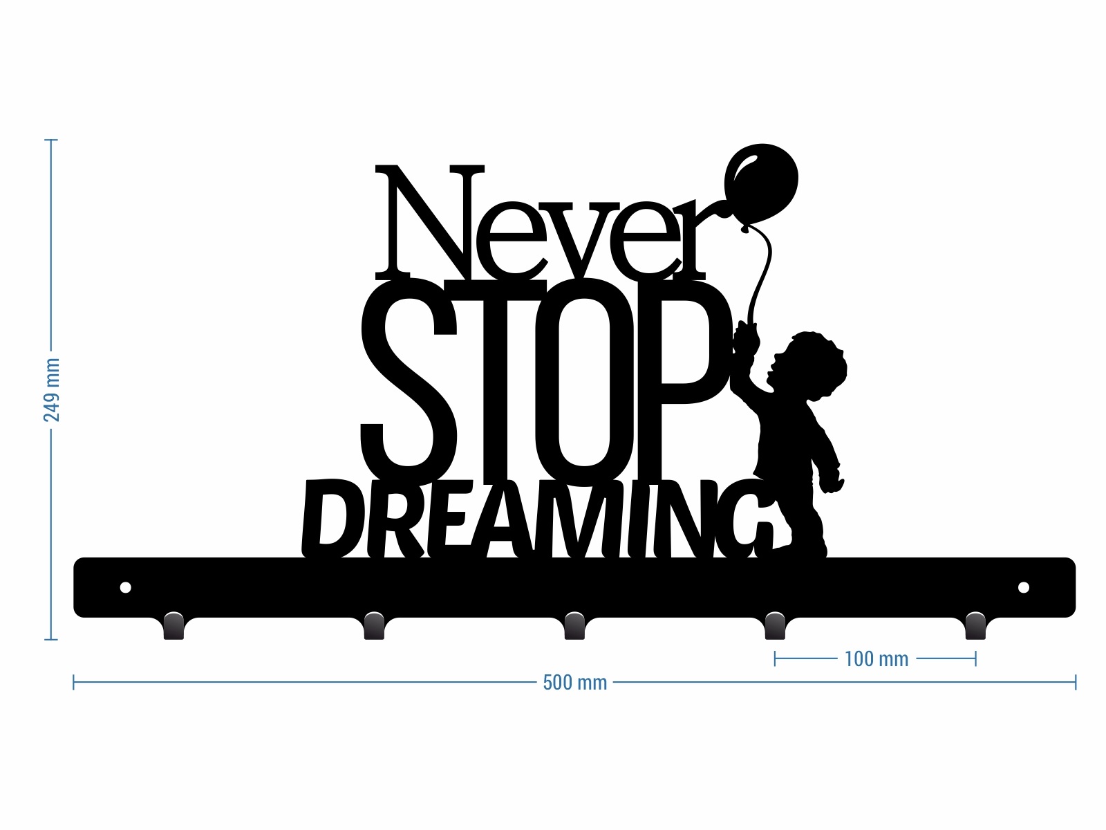 Unikatowy wieszak ścienny do przedpokoju z 5 haczykami. Jego całkowita szerokość wynosi 50 centymetrów. Dekoracyjny napis na wieszaku „Never stop dreaming” wniesie do Twojego przedpokoju pozytywną atmosferę!