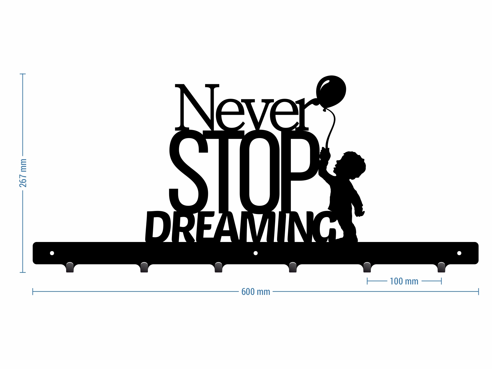 Unikatowy wieszak ścienny do przedpokoju z 6 haczykami. Jego całkowita szerokość wynosi 60 centymetrów. Dekoracyjny napis na wieszaku „Never stop dreaming” wniesie do Twojego przedpokoju pozytywną atmosferę!