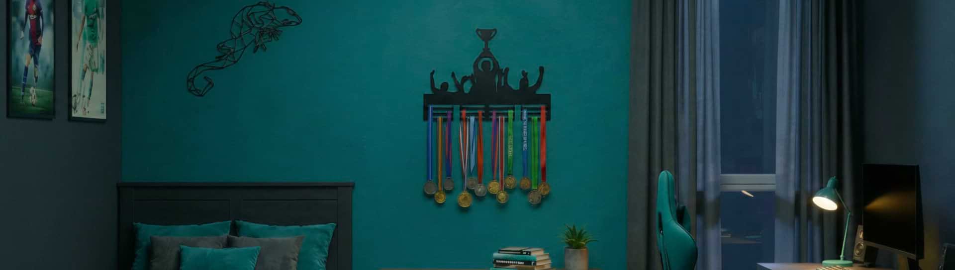 Odnosisz sukcesy w sporcie, ale twoje medale kurzą się na dnie szuflady? A może bliska ci osoba jest medalistą, który nie ma możliwości wyeksponowania swoich osiągnięć? Doskonałym rozwiązaniem tych problemów są wieszaki na medale! To element wyposażenia niezbędny dla każdego sportowca. Pozwala w prosty sposób wygospodarować miejsce na zdobyte trofea oraz elegancko zaprezentować swoje sportowe osiągnięcia. Dodatkowo, taki wieszak będzie stanowić ciekawy element dekoracyjny wnętrza. Świetnie odnajdzie się w pomieszczeniach loftowych oraz w pokojach urządzonych w młodzieżowym, nowoczesnym stylu. Wieszak na medale z motywacyjnym cytatem „Nigdy się nie poddawaj”, połączony z dekoracją ścienną, pozwoli stworzyć spójną aranżację, idealną dla każdej osoby kochającej sport!